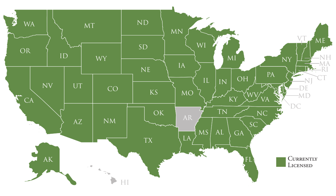 Expert and compassionate medical care for those struggling with eating disorders and disordered eating can be difficult to find. The Gaudiani Clinic is fully licensed to practice medicine and telemedicine in 48 states throughout the country (note: we are not currently licensed in Arkansas and Hawaii). Whether you're seeking a second opinion or trying to determine the next best steps in your treatment and care, the Gaudiani Clinic is able to provide expert medical oversight and primary care in the following green states: